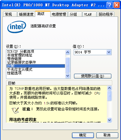 注:不同的intel網(wǎng)卡,最大巨幀值不同,總之,將其設(shè)置為最大值