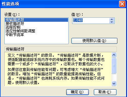 4、在“性能選項”頁面,點擊“傳輸描述符”,將值設(shè)置為最大2048;