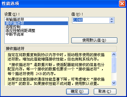5、在“性能選項”頁面,點擊“接受描述符”,將值設(shè)置為最大2048;