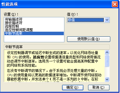 6、在“性能選項”頁面,點擊“中斷節(jié)流率”,將值設(shè)置為“極值”;