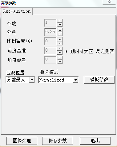 通過鼠標操作 ROI 選定模板,進入【高級參數(shù)】設(shè)置匹配角度范圍,最小相似度分數(shù),并可修改模板。