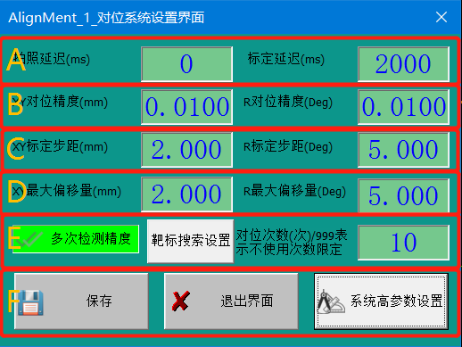 E. 多次對(duì)位檢測(cè)精度:勾選后對(duì)位方式變?yōu)椤芭恼?>對(duì)位->拍照復(fù)檢”循環(huán)。不勾選對(duì)位方式變?yōu)椤芭恼?>對(duì)位”循環(huán);
