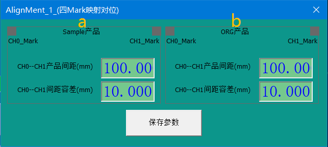 c. 產(chǎn)品尺寸對(duì)角對(duì)位:產(chǎn)品對(duì)位基準(zhǔn)為兩個(gè)互為對(duì)角的靶標(biāo) Mark,需要在下方“參數(shù)設(shè)置”區(qū)域?qū)懭氘a(chǎn)品在長(zhǎng)寬數(shù)值,長(zhǎng)方向?yàn)橄鄼C(jī)的 X 方向的產(chǎn)品長(zhǎng)度方向。