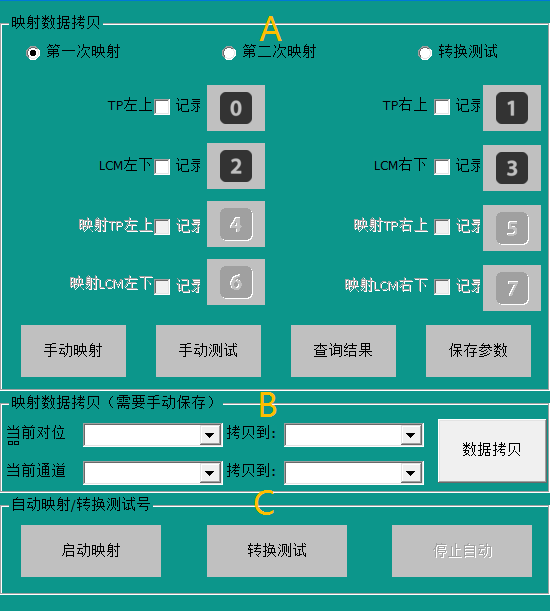 C. 自動(dòng)映射/轉(zhuǎn)換數(shù)據(jù)測(cè)試:將上述手動(dòng)操作流程使用自動(dòng)程序執(zhí)行。啟動(dòng)第一次映射/第二次映射流程時(shí),先點(diǎn)擊“啟動(dòng)映射”按鈕(啟動(dòng)后按鈕會(huì)變灰色),PLC 再發(fā)送拍照流程,兩次映射流程結(jié)束后(按鈕恢復(fù)狀態(tài),如果中途有拍照失敗也會(huì)恢復(fù)狀態(tài),且映射 NG 需要重新再來),映射數(shù)據(jù)系統(tǒng)會(huì)自動(dòng)保存。再啟動(dòng)“轉(zhuǎn)換測(cè)試”,PLC 再發(fā)送拍照流程,流程結(jié)束后,會(huì)彈出一個(gè)轉(zhuǎn)換測(cè)試數(shù)據(jù)。