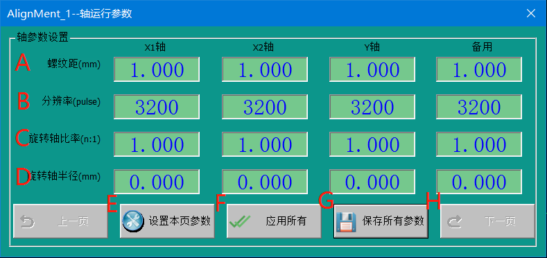 A. 螺紋距:每個軸對應(yīng)絲桿的螺紋距,即絲桿旋轉(zhuǎn)一圈前進(jìn)的距離;