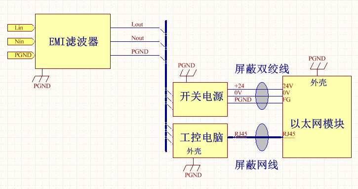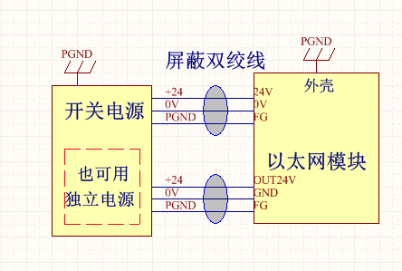3. 給以太網(wǎng)模塊的直流電源24V/0V,用帶屏蔽的雙絞線,屏蔽層兩端分別接開(kāi)關(guān)電源的PGND 和 模塊的FG。雙絞線線徑采用1.0~1.5平方的線。