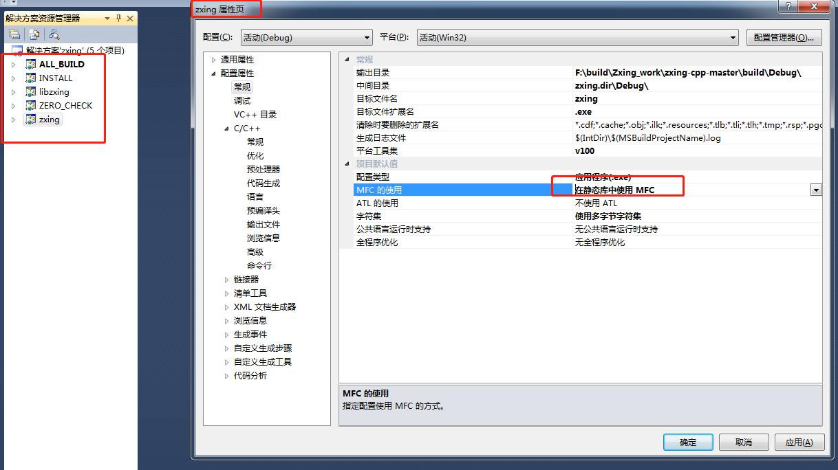 由于我要使用的zxinglib.lib 是在其他工程使用,必須跟所在的工程MFC使用庫保持一致,否則無法編譯通過(msvcprtd.lib(MSVCP100D.dll) : error LNK2005: "public: virtual __thiscall std::basic_ios<char,struct std::char_traits<char> )。所以這里我選擇了在靜態(tài)庫中使用MFC跟我要用的MFC工程保持一致。