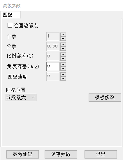 通過鼠標(biāo)操作ROI選定模板,進(jìn)入【高級(jí)參數(shù)】設(shè)置匹配角度范圍,最小相似度分?jǐn)?shù),并可修改模板。