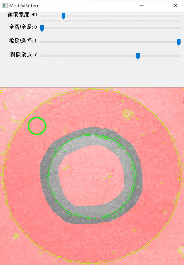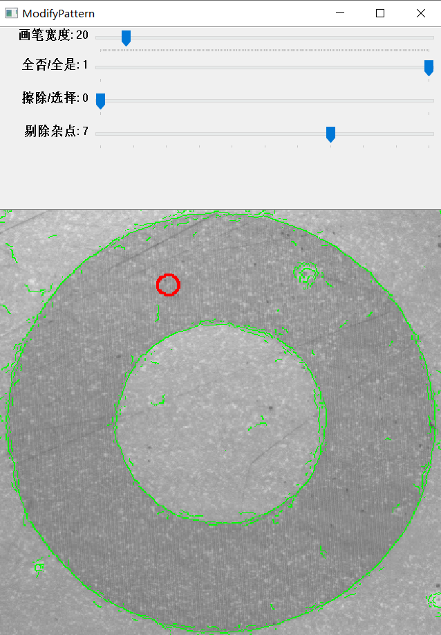 當(dāng)圖像的質(zhì)量較差時(shí),邊緣模糊產(chǎn)生大量的雜點(diǎn);從而增加了搜索的時(shí)間,同時(shí)影響了搜索的準(zhǔn)確性。通過調(diào)整【剔除雜點(diǎn)】去除大部分的干擾點(diǎn),優(yōu)化了模板的輪廓信息。