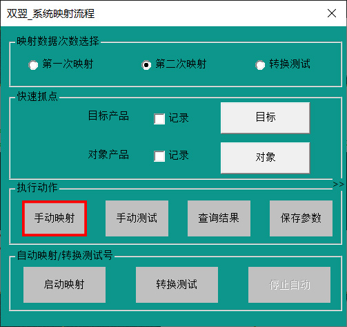 1) 系統(tǒng)全體停止,將TP搬運(yùn)到目標(biāo)相機(jī)下,打開映射界面,勾選第一次映射,再勾選目標(biāo)產(chǎn)品“記錄”,點(diǎn)擊“目標(biāo)”按鈕,系統(tǒng)會抓取Mark點(diǎn)的坐標(biāo)。