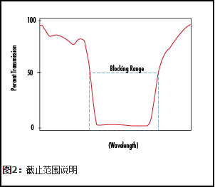 截止范圍:截止范圍是用于表示通過(guò)濾光片衰減的能量光譜區(qū)域的波長(zhǎng)間隔(圖2)。截止的程度又稱(chēng)之為截止深度,通常用光密度或者透射率表示。