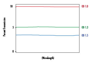 光密度(OD):光密度(OD)描述濾光片截止程度,并且與穿過(guò)的能量透射量有關(guān)(方程式1–2)。光密度值越高透射率越低,圖3示意了三種不同的光密度:OD 1.0,OD 1.3和OD 1.5分別對(duì)應(yīng)的透射率。T為透射率,如80,表示透射率80%。