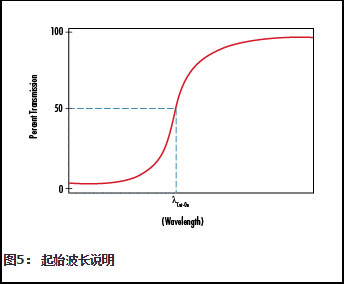 起始波長(zhǎng):起始波長(zhǎng)是用于表示在長(zhǎng)波通濾光片中透射率增加至50%波長(zhǎng)的術(shù)語(yǔ)。起始波長(zhǎng)由圖5中的λcut-on起始表示。