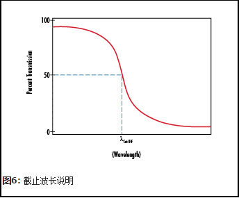 截止波長(zhǎng):截止波長(zhǎng)是用于表示在短波通濾光片中透射率降低至50%波長(zhǎng)的術(shù)語(yǔ)。截止波長(zhǎng)由圖6中的λcut-off截止表示。