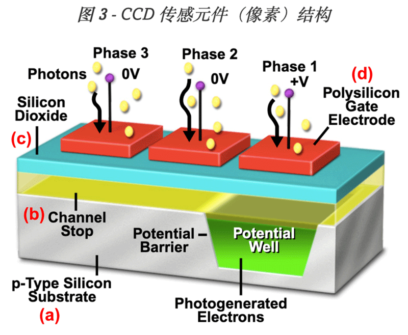 典型的 CCD 器件有四層:(a)底部摻雜硼的硅襯底(Silicon Substrate)、(b)溝道停止層(Channel Stop)、(c)氧化層(Silicon Dioxide)和(d)用于控制的柵電極(Polysilicon Gate Electrode)。