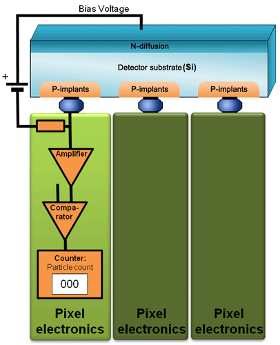 CMOS像元工作示意圖。傳感器像素(一個反向偏置的二極管)連接到讀出芯片中的像素電子元件