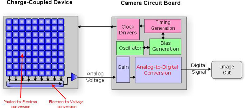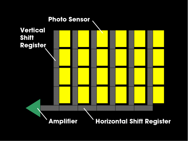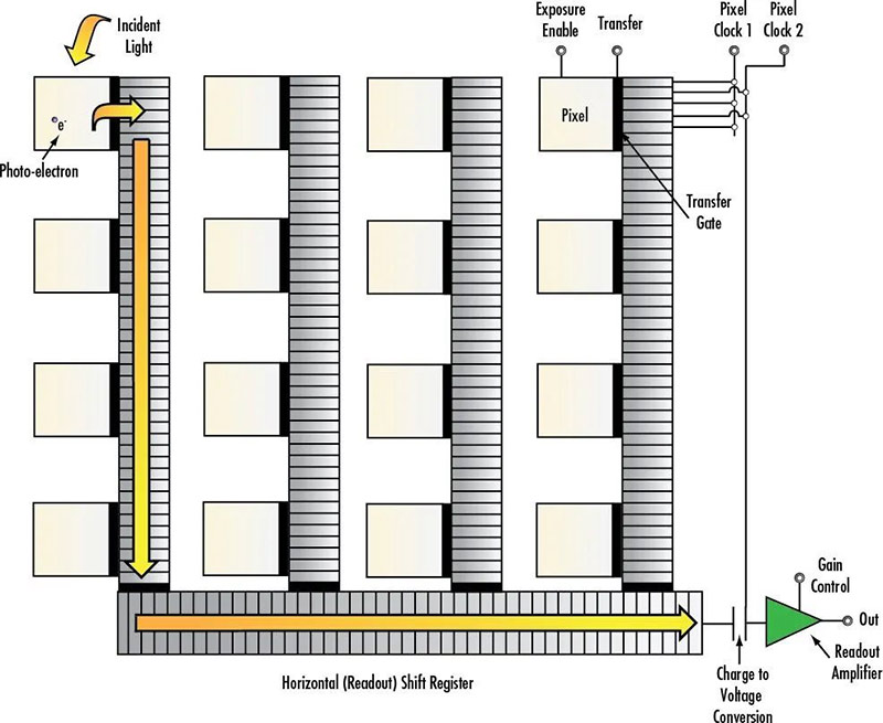 CCD本質(zhì)上是一個大陣列的半導(dǎo)體“桶”,可以將傳入的光子轉(zhuǎn)換為電子并保持累積的電荷。這些電荷,可以被垂直移位寄存器,向下轉(zhuǎn)移到水平移位寄存器,水平移位寄存器以將電荷轉(zhuǎn)換為電壓并輸出。