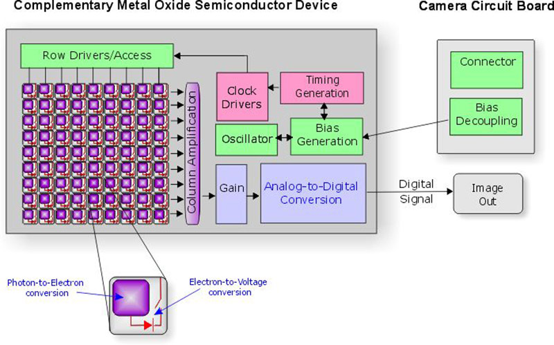 CMOS外觀圖;包含像元,數(shù)字邏輯電路,信號處理器,時鐘控制器等
