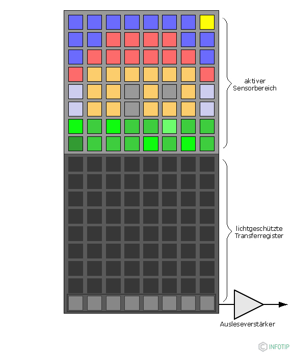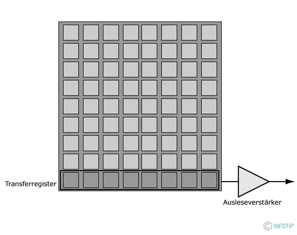 在曝光時間結(jié)束時,來自傳感器單元的電荷同時傳輸?shù)剿邢袼氐闹虚g存儲器,并通過垂直和水平位移從那里讀出。行間傳輸CCD的優(yōu)勢在于它們可以快速、完全地從傳感器單元接收圖像信息,中間存儲不需要機械鎖。這種設(shè)計的缺點是,傳感器的填充系數(shù)較低,這會導(dǎo)致對光的敏感度降低,或在低光下更容易產(chǎn)生噪音。