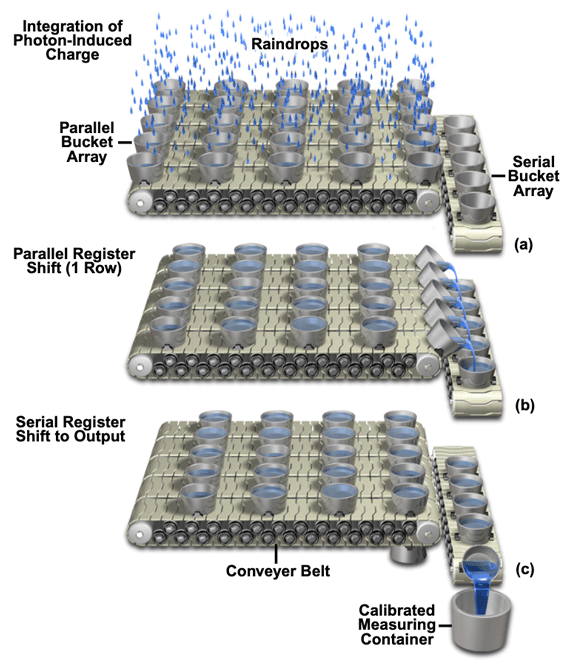這些桶在積分期間收集了不同數(shù)量的信號(水),桶在傳送帶上向代表串行寄存器(Serial Bucket Array)的一排空桶傳送。在圖(b),一整排存儲桶被并行移動到串行寄存器的存儲庫中。串行移位和讀出操作如圖(c)所示,其中描繪了每個桶中累積的雨水被順序轉(zhuǎn)移到校準(zhǔn)的測量容器中,這類似于CCD輸出放大器。當(dāng)串行傳送帶上所有容器的內(nèi)容物按順序測量完畢后,另一列并行班次(Parallel Register Shift)將下一行收集桶的內(nèi)容物轉(zhuǎn)移到串行記錄容器中,重復(fù)該過程,直到每個桶(像素)的內(nèi)容物都測量完畢。
