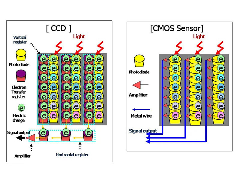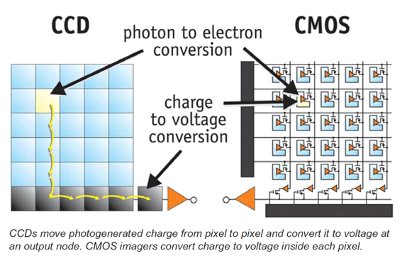 CCD和CMOS傳感器之間的主要區(qū)別在于處理每個像素的方式:CCD將光生電荷從一個像素移動到另一個像素,并在輸出節(jié)點將其轉(zhuǎn)換為電壓。CMOS成像器,在每個像素上使用多個晶體管,將每個像素內(nèi)的電荷轉(zhuǎn)換為電壓,以使用更傳統(tǒng)的導(dǎo)線放大和移動電荷。
