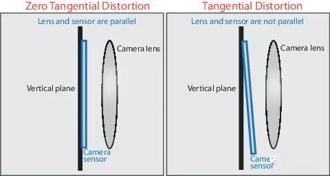 切向畸變是由于透鏡本身與圖像平面不平行而產(chǎn)生的,這種情況多是由于透鏡被粘貼到鏡頭模組上的安裝偏差導(dǎo)致。