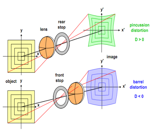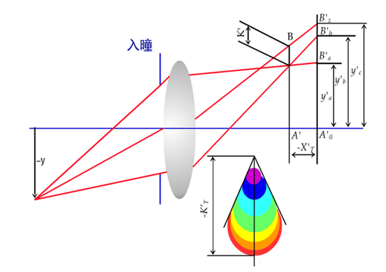 色差:由白色物體向光學系統(tǒng)發(fā)出一束白光,經(jīng)光學系統(tǒng)折射后,各色光不能會聚于一點上,而形成一彩色像斑,稱為色差?;儯罕慌钠矫鎯?nèi)的主軸外直線,經(jīng)光學系統(tǒng)成像后變?yōu)榍€,則此光學系統(tǒng)的成像誤差稱為畸變。