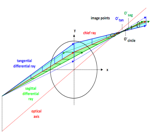 像散:由位于主軸外的某一軸外物點,向光學系統(tǒng)發(fā)出的斜射單色圓錐形光束,經(jīng)該光學系列折射后,不能結(jié)成一個清晰像點,而只能結(jié)成一彌散光斑,則此光學系統(tǒng)的成像誤差稱為像散。
