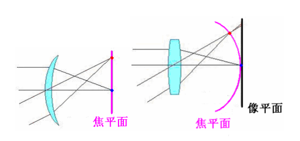 場曲:垂直于主軸的平面物體經(jīng)光學系統(tǒng)所結(jié)成的清晰影像,若不在一垂直 于主軸的像平面內(nèi),而在一以主軸為對稱的彎曲表面上,即最佳像面為一曲面,則此光學系統(tǒng)的 成像誤差稱為場曲。