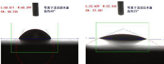下圖5顯示一種塑膠材料等離子清潔后水滴角從約60°的變?yōu)榧s22°,活性增強(qiáng)。