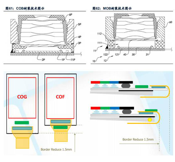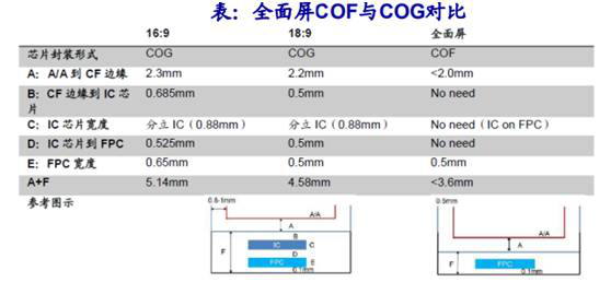 目前手機顯示主要采用COG技術進行驅動芯片的封裝。18:9顯示屏仍然可以采 用COG工藝,但是未來幾年隨著全面屏從18:9向19:9甚至20:9演進,COG將越發(fā)力不從心。而采用COF的全面屏,其下端邊框可能縮小至3.6mm的距離甚至更小,因此COF將滿足更高屏占比的需求。