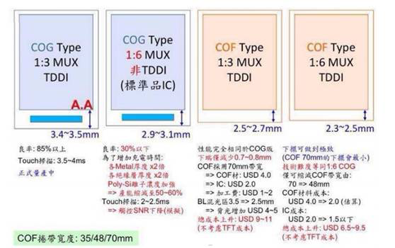 對于全面屏而言,最佳的方式是基于COF工藝(即觸控IC固定于FPC軟板上), 相比于COG可以進一步提升顯示面積。根據(jù)臺灣工研院的研究數(shù)據(jù),盡管采用 COF的1:6 MUX TDDI方案比采用COG的1:3 MUX TDDI的成本上升6.5-9.5美元, 但是下邊框尺寸極限可以由3.4-3.5mm縮減至2.3-2.5mm。