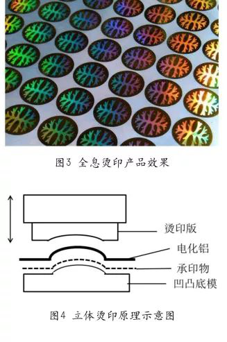 立體燙印又稱為凹凸?fàn)C印,它是一種將燙印和壓凹凸一次完成的工藝技術(shù),燙印原理如圖4。燙印時(shí),需制作精密的立體燙印版和與之相對(duì)應(yīng)的底模。立體燙印版一般采用銅、鋅、鎂等金屬材質(zhì),利用電腦控制軟件進(jìn)行三維雕刻,現(xiàn)常用的制版方法為電腦數(shù)控雕刻制版(CNC),該方法制作的燙印版使?fàn)C印產(chǎn)品質(zhì)量穩(wěn)定、定位準(zhǔn)確、圖案邊緣清晰、耐印率高等。底膜一般采用石膏或新型高分子材料制得,在立體燙印過程中,由于燙印凹版是處于加熱狀態(tài),會(huì)產(chǎn)生一定的膨脹變量,而底模是處于室溫狀態(tài),所以在燙印過程中要考慮到與燙印版的易合精確度。
