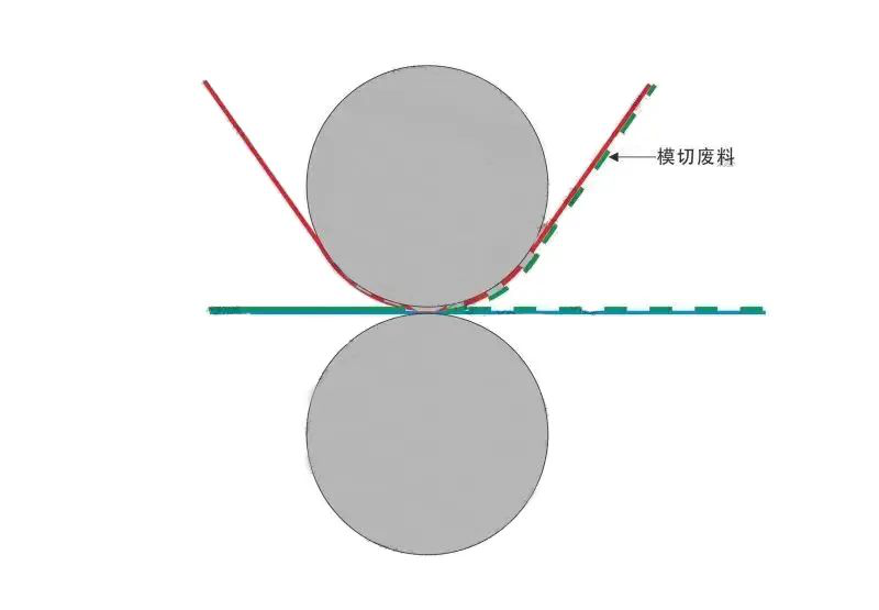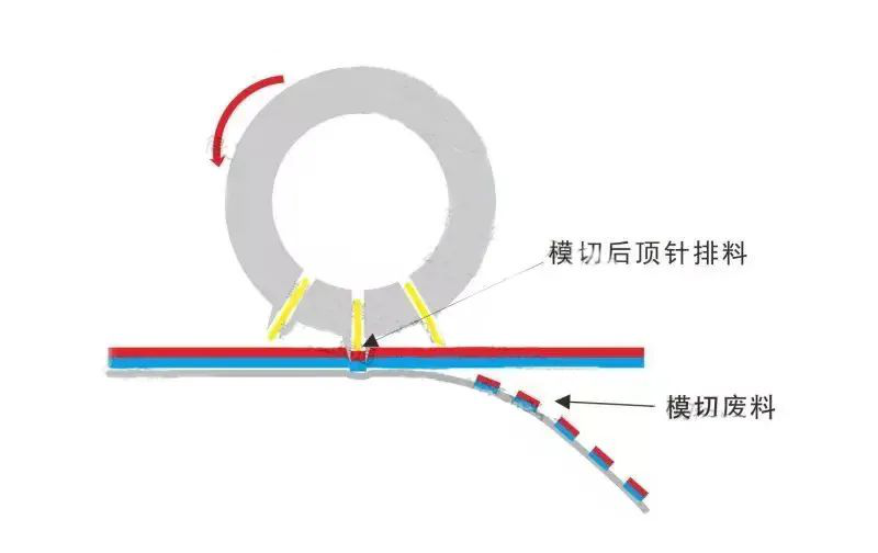 即將模切產(chǎn)生的廢料帶走。排廢是圓刀機(jī)加工過程中的關(guān)鍵,也是難點(diǎn)所在。在長(zhǎng)期實(shí)踐生產(chǎn)中產(chǎn)生了多種方法,針對(duì)不同的情況,使用不同的方法。