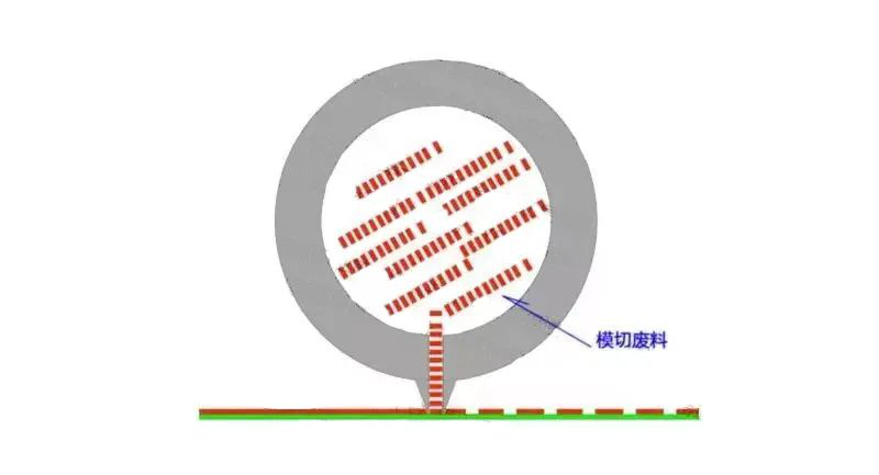 輔料直排廢工藝的刀模設(shè)計(jì)通常采用半斷模切設(shè)計(jì),成型后剝離料帶,廢料留在底膜料帶上,直接帶走。如下圖所示(針對(duì)的產(chǎn)品有要求,廢料部分多為產(chǎn)品內(nèi)框)。