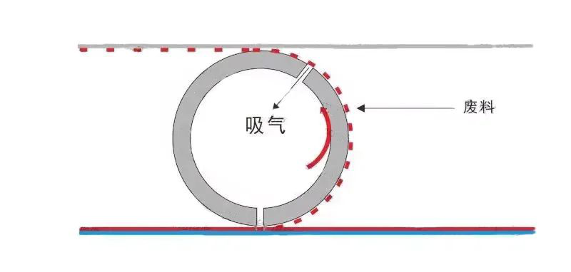 吸氣刀通過大功率吸氣裝置連接刀體,產(chǎn)生吸力將模切的產(chǎn)品廢料吸附在表面的刀腔上,再用排廢料帶排走,使一些較難排除的大片廢料排廢順暢;吸廢刀可將模切廢料吸入刀體內(nèi)部,再從軸頭一端連接的吸氣裝置吸出,在節(jié)約材料、降低刀刃的損傷率上有良好的效果。經(jīng)過驗(yàn)證,直徑在3~10mm之間廢料可以吸廢效果是最好的。