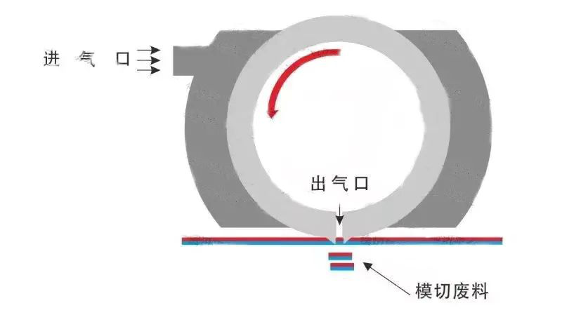 吹氣式排廢圓刀也叫吹氣清廢刀,氣沖式排廢圓刀。是通過高壓空氣作用將廢料吹離模切材料和刀腔,防止廢料卡在刀腔并進(jìn)行排廢的一種圓刀工藝。在刀體側(cè)端安裝一塊導(dǎo)氣卡環(huán),將高壓空氣精確的引導(dǎo)到對(duì)應(yīng)的排廢氣孔上把整排廢料吹出,一般還會(huì)配合吸廢盒使用,更好的收集模切出來的廢料。