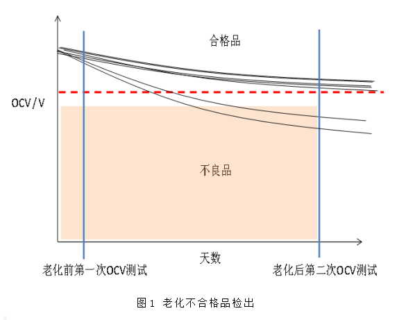 極片上的顆?;蛭⒘拷饘贇堅⒏裟ど系奈⑿∪毕?、電芯在組裝過程中引入的粉塵等,都會造成電芯內(nèi)部微短路。對于微短路電芯,僅通過容量及一次電壓是無法完成篩選的,因此必須引入K值測試:通過精確計算其電壓降速率來判斷電芯是否存在微短路情況,如圖1所示。