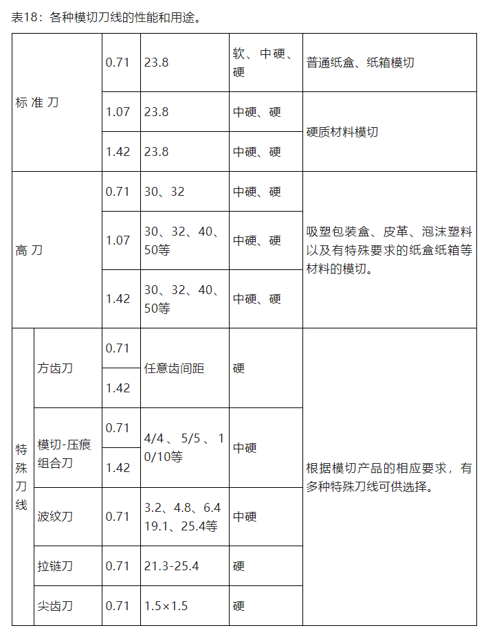 模板切割完成后,要根據(jù)所模切紙盒相對(duì)位置裝模切刀和壓痕線,為了保證模切質(zhì)量,首先應(yīng)選擇質(zhì)量較好的模切刀和壓痕線,我們首先介紹一下模切刀,下表所列模切刀系列產(chǎn)品,詳細(xì)地介紹了各種標(biāo)準(zhǔn)模切刀和特殊模切刀的具體性能和用途。如表18