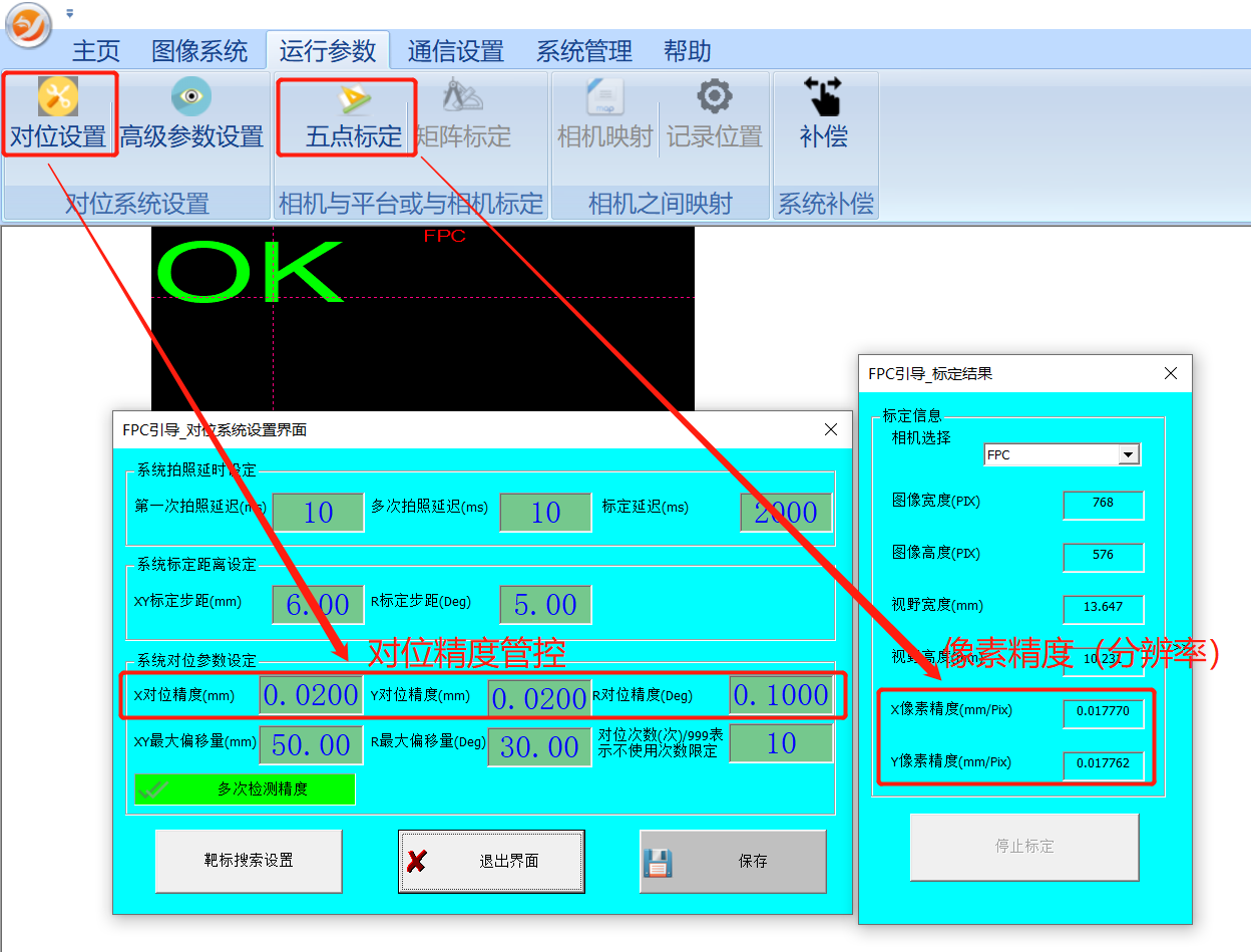 對(duì)位精度設(shè)定,一般情況下,建議設(shè)定為標(biāo)定后像素精度的1~2倍范圍內(nèi),比如我們標(biāo)定后得到的精度是0.01770mm/pixel,建議設(shè)定的精度范圍為0.0177mm~0.0354mm范圍內(nèi),若是需要設(shè)定更高的精度,需要保障圖像成像效果和平臺(tái)機(jī)構(gòu)的精度。