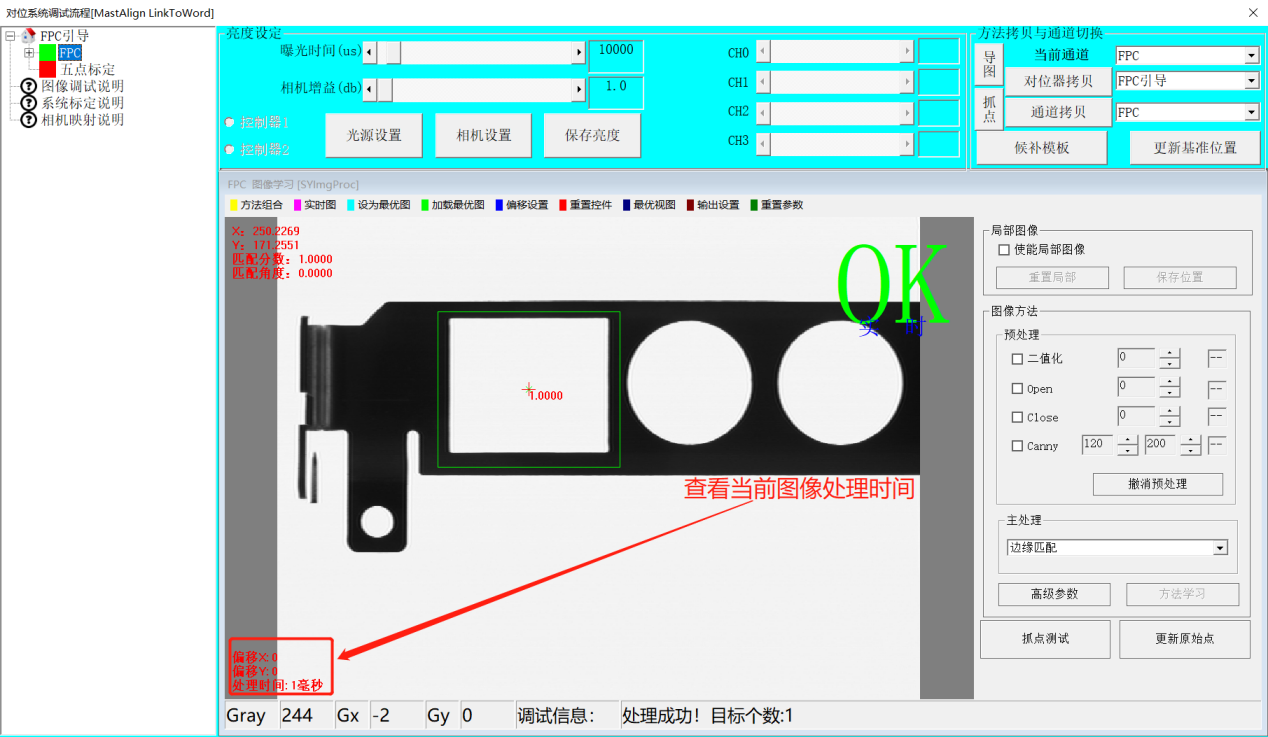 通過(guò)進(jìn)入模板學(xué)習(xí)界面可以查看當(dāng)前圖像處理消耗的時(shí)間,如圖6所示,圖像處理為1ms。