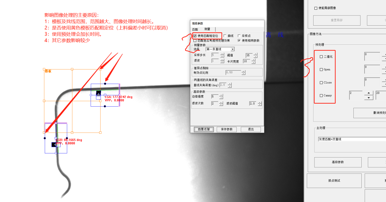 根據(jù)不同的應(yīng)用場(chǎng)景選擇合適的圖像處理算子工具,通過(guò)對(duì)應(yīng)的圖像處理參數(shù)設(shè)定,減少?zèng)]有必要的圖像處理開銷,提升圖像處理效率。舉例說(shuō)明:如產(chǎn)品來(lái)料基本控制在2度范圍內(nèi),在做模板匹配的時(shí)候,搜索的圖像范圍不需要設(shè)定在(-180,180)之間搜索,在小的角度(-5,5)范圍內(nèi)搜索即可,合理設(shè)定相關(guān)參數(shù)可提升圖像處理效率。