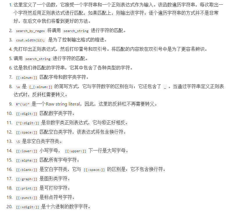 match_result用來存儲(chǔ)查找的結(jié)果。regex_search在字符串中查找匹配字符。[[:alnum:]]{5}是指:字符或者數(shù)字出現(xiàn)5次。\\w{5,}是指:字母,數(shù)字或者下劃線出現(xiàn)5次或更多次。R"(\W{3,5})"是指:非字母,數(shù)字或者下劃線出現(xiàn)3次到5次。[[:digit:]]*是指:數(shù)字出現(xiàn)任意多次。.+是指:任意字符出現(xiàn)至少1次。[[:lower:]]?是指:小寫字母出現(xiàn)0次或者1次。該程序輸出如下: