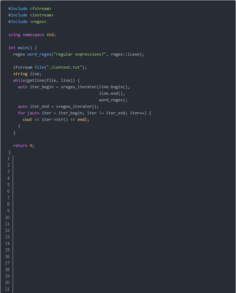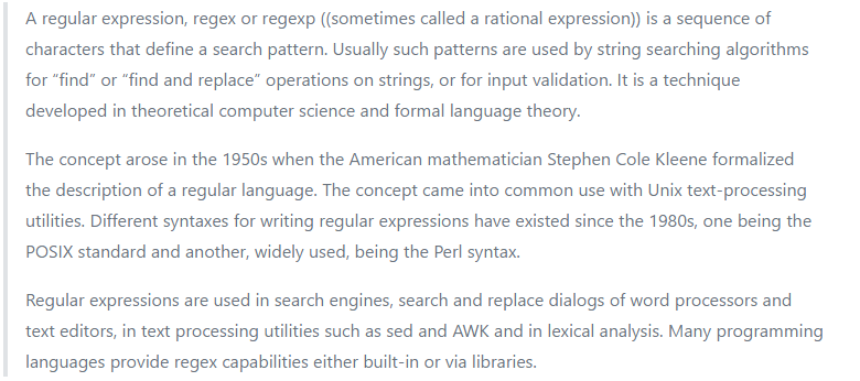 接下來我們會看到更多的示例。同時,也會看到C++正則表達(dá)式API的更多功能。 為了便于下文示例的講解,我們以維基百科上對于正則表達(dá)式的介紹文本為基礎(chǔ)。