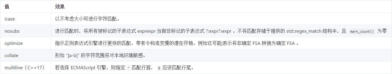 在創(chuàng)建正則表達(dá)式對象的時候,除了描述規(guī)則本身的字符串之外,還可以傳遞一個flag_type類型的參數(shù),該參數(shù)的值定義在std::regex_constants::syntax_option_type中。它們中與“文法”相關(guān)的已經(jīng)在上文介紹過了。