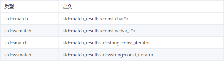 std::match_results用來存儲匹配結(jié)果。與迭代器類似,匹配結(jié)果也有四種類型: