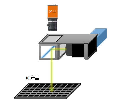 激光打標(biāo)系統(tǒng)采用偽同軸結(jié)構(gòu),由半透半反棱鏡將側(cè)面射出的激光折射90°,垂直向下。CCD從上往下拍攝,透過(guò)半透半反棱鏡拍攝CCD下方的IC產(chǎn)品,進(jìn)行圖像分析定位。相機(jī)將計(jì)算出的像素坐標(biāo)轉(zhuǎn)換為激光器的物理坐標(biāo),控制激光器振鏡偏轉(zhuǎn)實(shí)現(xiàn)定位打標(biāo)。