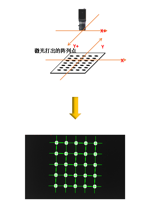 系統(tǒng)采用宮格標(biāo)定,自定義行列數(shù)和間距,控制激光器打出陣列點(diǎn),然后通過(guò)相機(jī)進(jìn)行圖像處理獲取對(duì)應(yīng)的像素坐標(biāo)點(diǎn)。利用算法將相機(jī)像素坐標(biāo)與激光器的坐標(biāo)進(jìn)行統(tǒng)一。