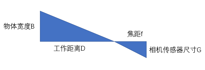 鏡頭焦距f=(工作距離D×相機傳感器短邊尺寸G) / 物體寬度B,單位:mm。