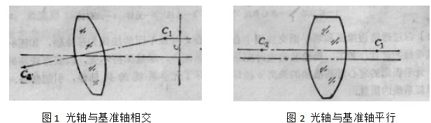 定心的目的是使中心線與機(jī)械中心線合而為一,另一功能則是控制鏡片的外徑達(dá)到公差配合。為了滿足光學(xué)成像的要求,需要保證鏡片的光軸在一條直線上。但在加工與裝配時(shí)的鏡片是以外圓進(jìn)行定位,但單單依靠外圓定位,無法保證光軸一致性,那么就要求透鏡在生產(chǎn)過程時(shí)要有定心磨邊這一步驟。精磨拋光后的透鏡一般都還未定心,此時(shí)存在的中心誤差,中心誤差會有兩種情況:透鏡自身光軸與系統(tǒng)理想光軸交叉(圖1),透鏡自身光軸與系統(tǒng)理想光軸平行的情況(圖2)。